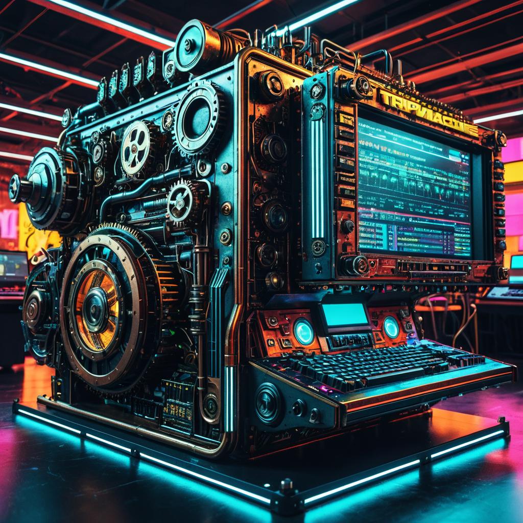 Highly detailed 3D render of a massive steampunk-inspired computer named 'Tripmachine' with intricate machinery and fluorescent multicolored lighting. The design features exposed gears, pipes, and gauges integrated into a computer with glowing screens and keyboards, presented in a vibrant futuristic environment.