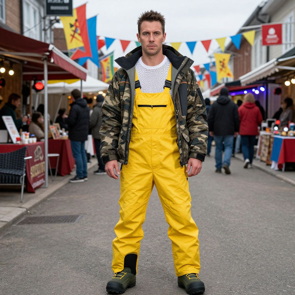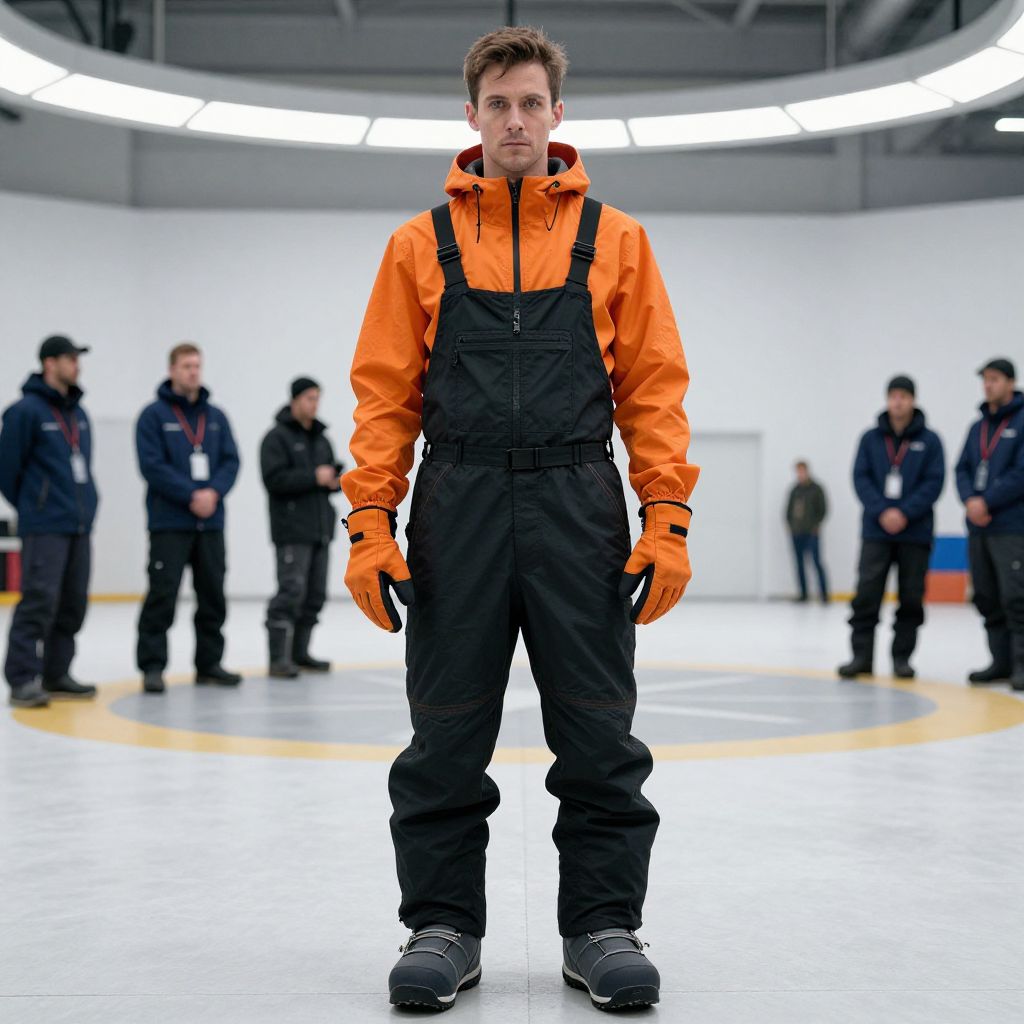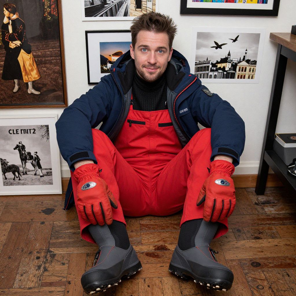 A man, navy blue Gore-Tex jacket, bright red ski overalls, black thermal base layer, gray waterproof snow boots, sporty red gloves, vintage charm, creaky wooden floors, eclectic art displays, 3M analog film stock, relaxed smile, enjoying the cozy atmosphere. Man has masculine face and piercing eyes