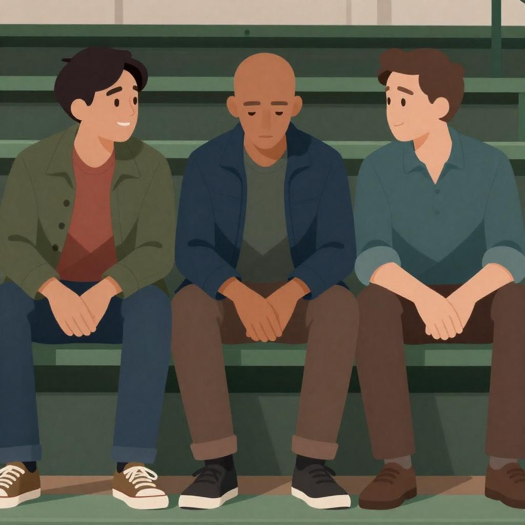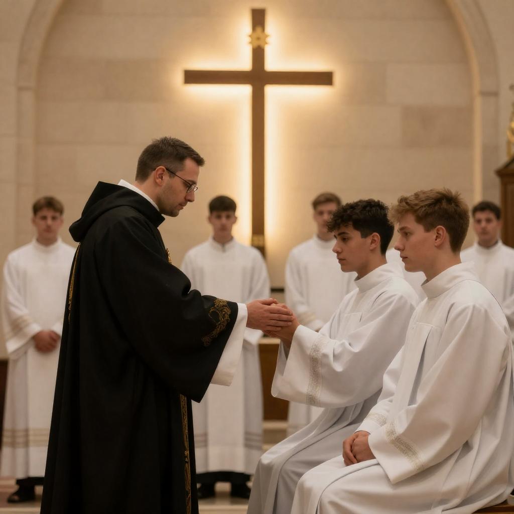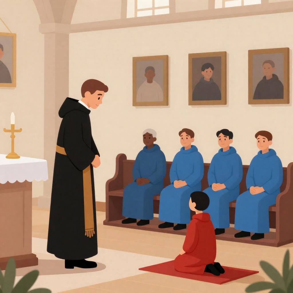 Digital illustration of a church interior. A black-robed priest with a white collar stands at an altar on the left, leaning forward. Five blue-robed clergy members sit in pews in the background. A small red figure kneels on a prayer mat in the foreground. The walls are adorned with framed pictures and the floor is wooden.