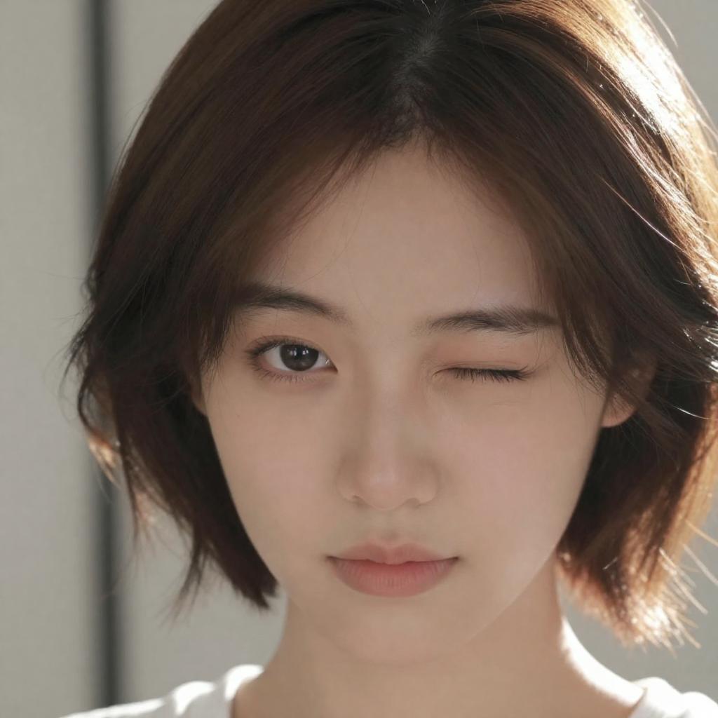 Close-up photograph of a young woman with short brown hair, slightly winking, looking downward. Soft sunlight creates a lens flare on the right. She has light skin, subtle makeup, and a neutral expression. Background is out of focus with a thin, dark line.