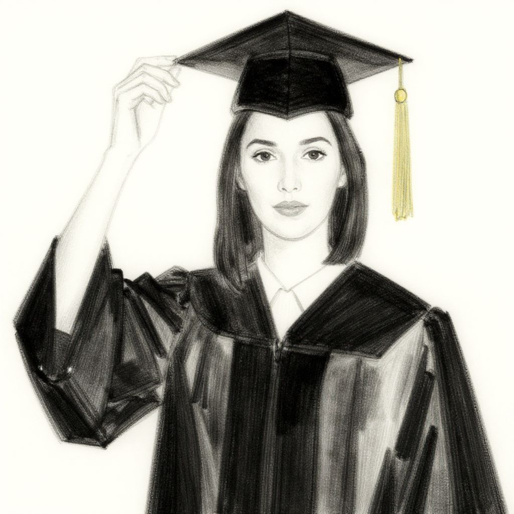 Black-and-white digital sketch of a woman with shoulder-length hair, wearing a graduation cap and gown, tipping the cap with her right hand.