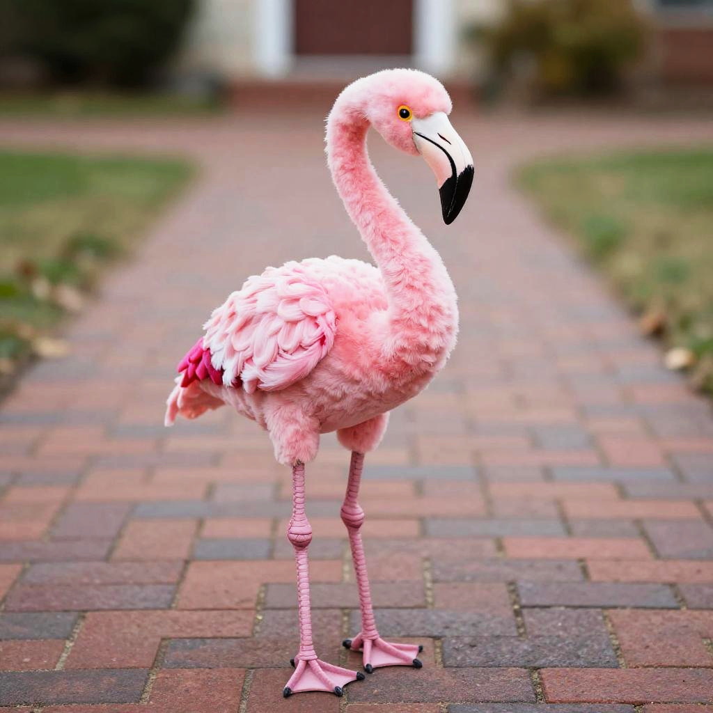 Infant Flamingo Halloween, baby in a pink outfit standing on a brick walkway