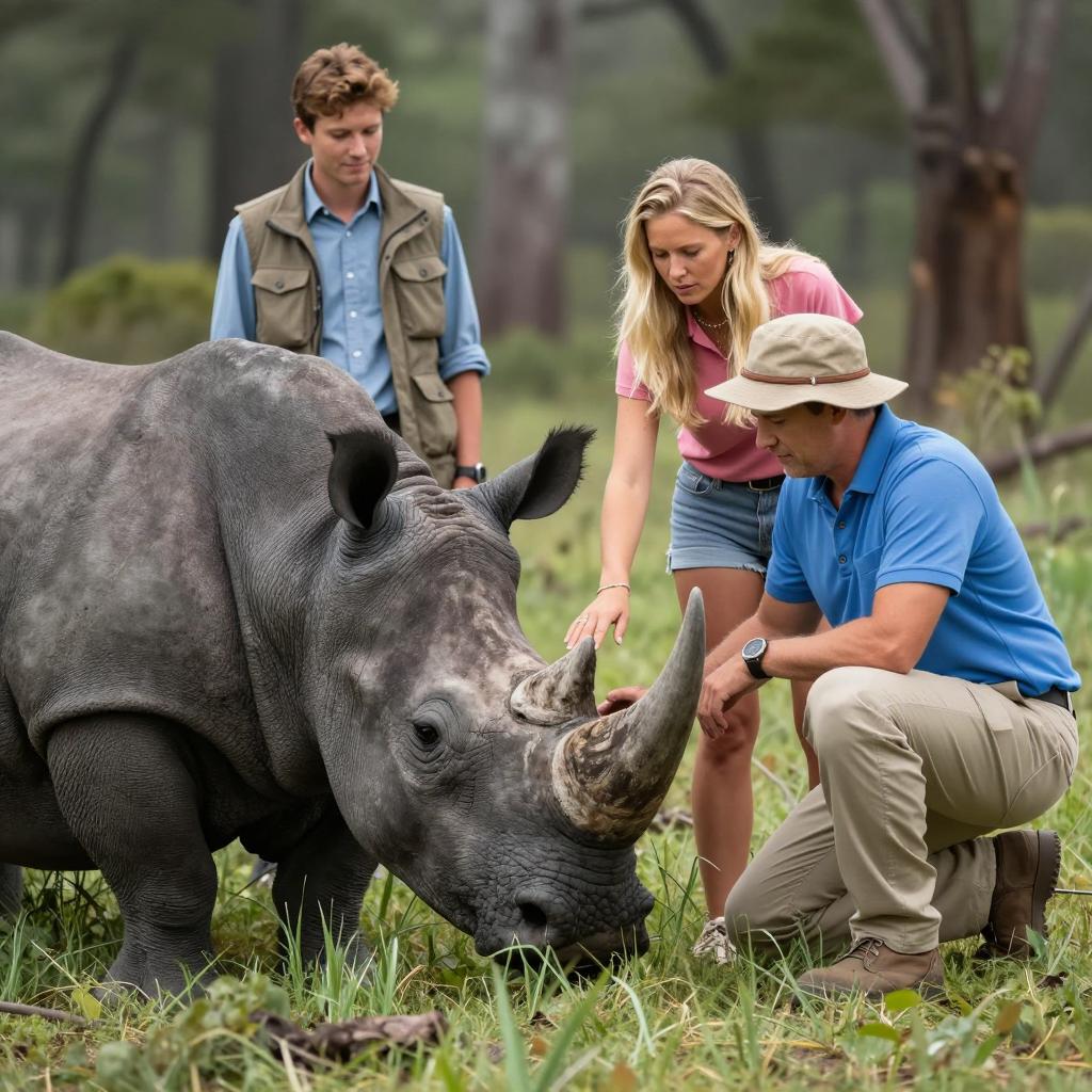 Photograph of three people. Center: large gorilla with gray fur and white beard, smiling. Left: middle-aged man with gray hair, smiling, wearing dark jacket. Right: woman with brown hair, smiling, wearing white shirt with black design. Man's arm around gorilla's shoulder. Background: wooden cabinet, blue wall.