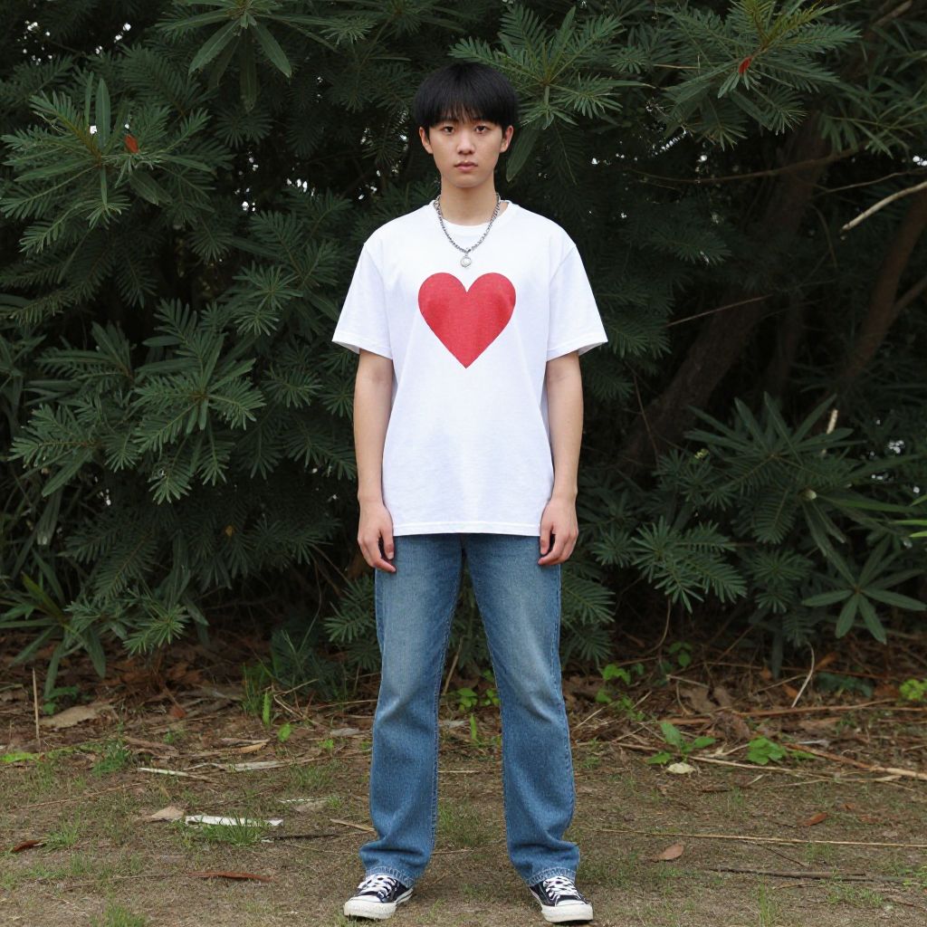 Photograph of a young Asian man standing outdoors in front of a dark green pine tree. He has short black hair, a pale skin tone, and is wearing a white T-shirt with a large red heart on the chest, blue jeans, and black and white sneakers. A thin necklace with a small pendant hangs around his neck. The ground is covered in grass and small patches of dirt. The man's expression is neutral, and he stands with his arms relaxed at his sides. The image has a slightly over-exposed, digital art-like quality.