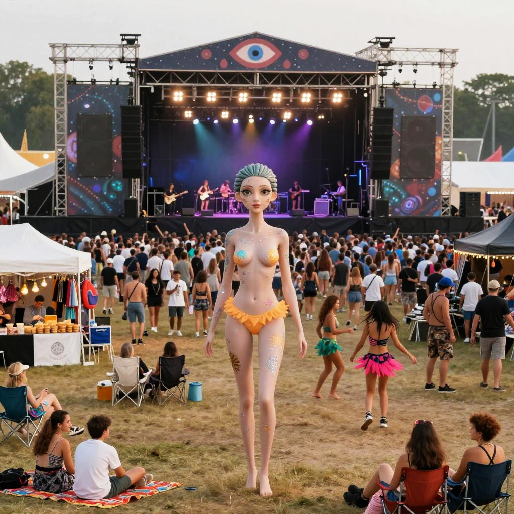 Outdoor music festival scene with a large crowd gathered in front of a stage featuring colorful lighting and live musicians. Central focus on a stylized, tall, slender female figure with detailed skin, adorned with body paint and glitter. The figure has long hair styled with ribbons and a punk aesthetic, wearing minimal orange costume pieces. Festival attendees around the figure dress in casual summer clothing, sitting or standing on the grassy grounds with booths and tents visible in the background.