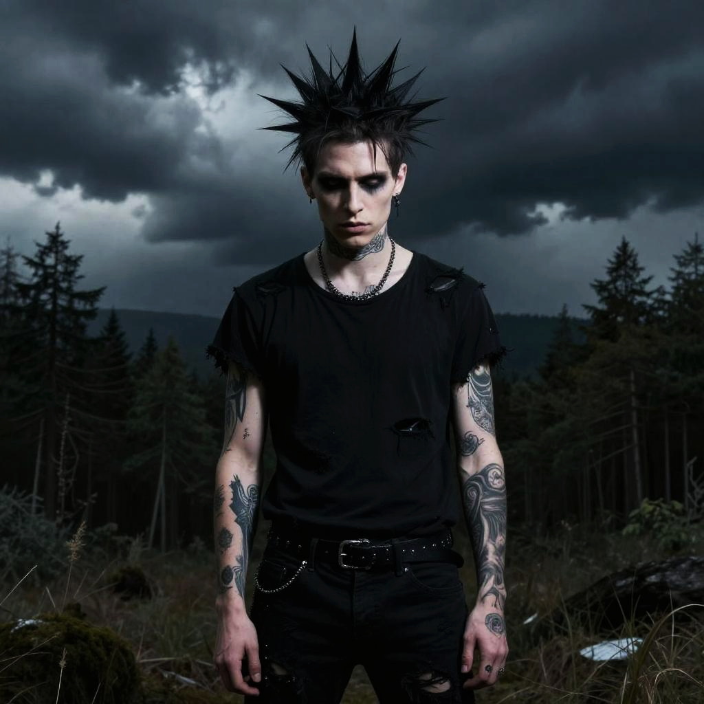 Goth guy with spiked hair and dark tattoos, wearing ripped black clothing, standing against a backdrop of a stormy sky and sprawling dark forest, intense and dramatic lighting