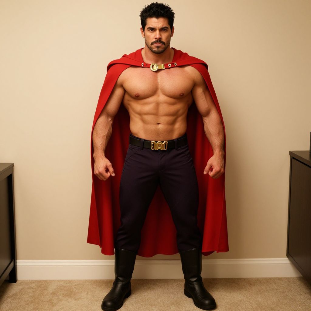 "fancy superhero costume, 1boy, male focus, solo, cape, red cape, outdoors, sunglasses, superhero, black hair, pants, belt, tree, full body, facial hair, blurry, blurry background, standing, road, realistic, boots, short hair Realistic photo of casual sexy person with pretty face"