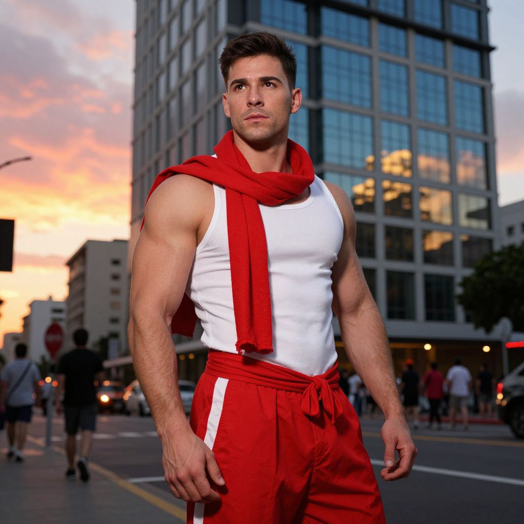 A man wearing a red outfit with a white shirt and a red scarf around his waist, standing on a street with a building in the background. The man has a muscular build, well-defined features, and a confident posture. The scene is set in a bustling city street at sunset, with the warm hues of the setting sun casting a dramatic light across the scene. The building in the background is a modern, high-rise structure with glass windows reflecting the vibrant colors of the sky. The overall atmosphere is lively and dynamic, emphasizing the man's presence and the vibrant energy of the urban environment.