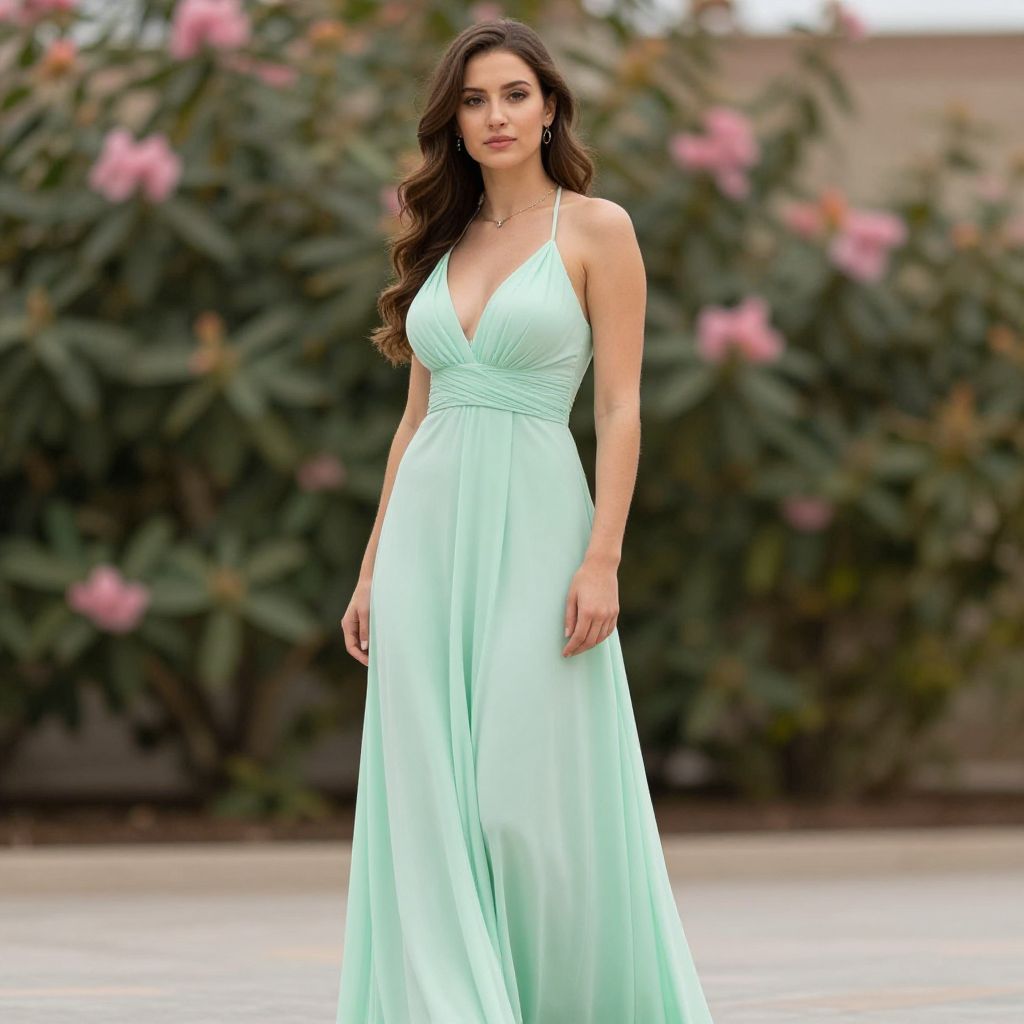 Photograph of a beautiful woman with long, wavy brown hair wearing a flowing, mint green, sleeveless gown with a deep V-neck, standing