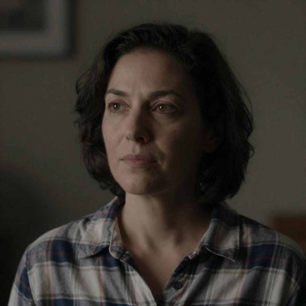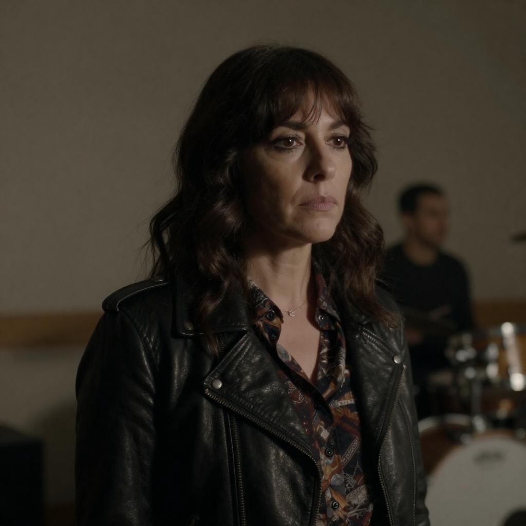 Photograph of a middle-aged woman with dark, wavy hair and bangs, wearing a black leather jacket over a patterned shirt. She has a serious expression and is slightly turned to the right. In the blurred background, there is a dimly lit room with a musician playing a drum set. The lighting is low, creating a moody atmosphere.