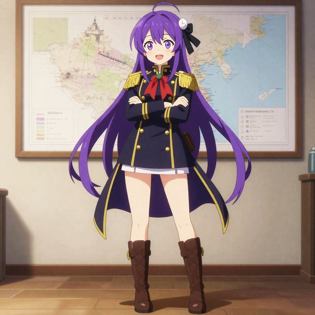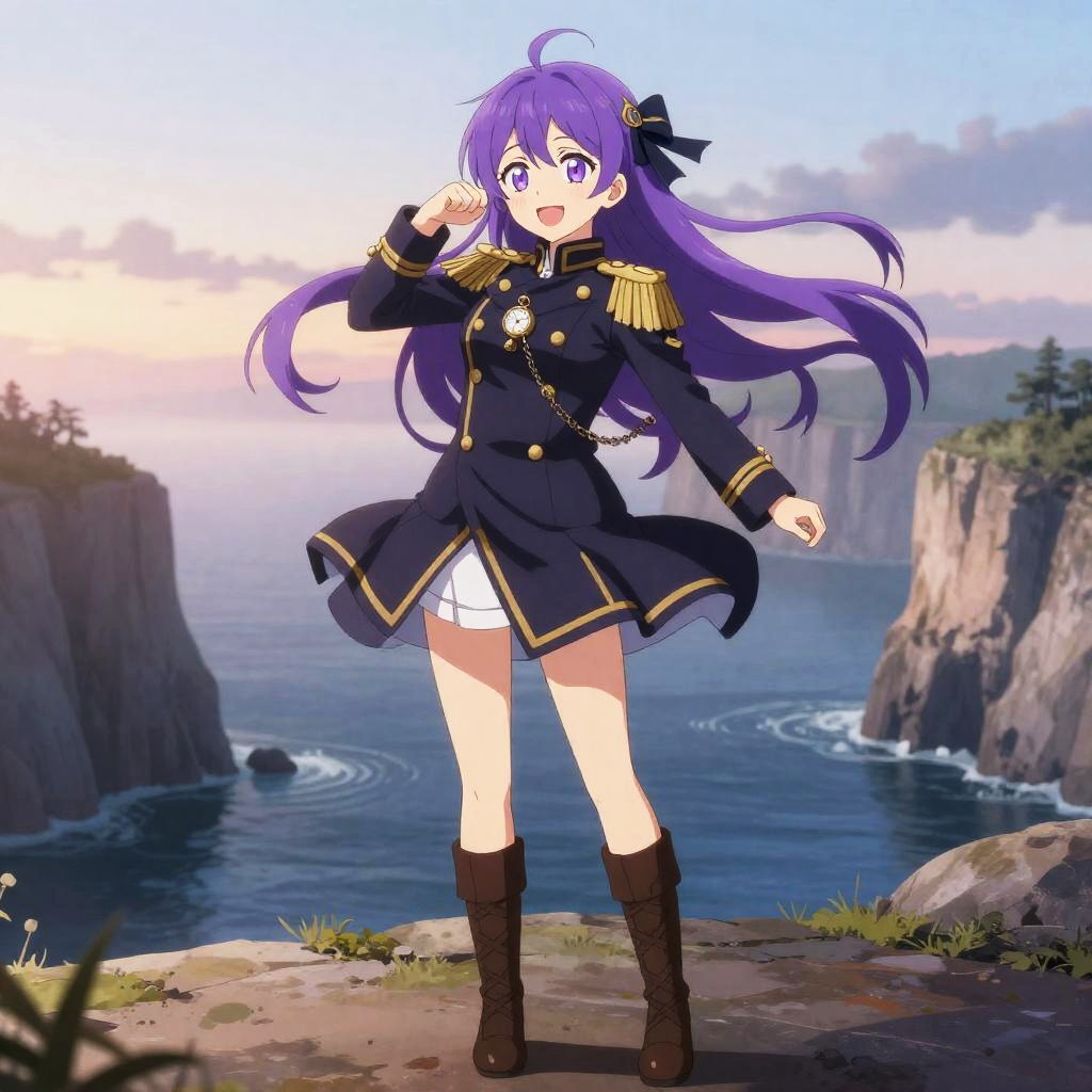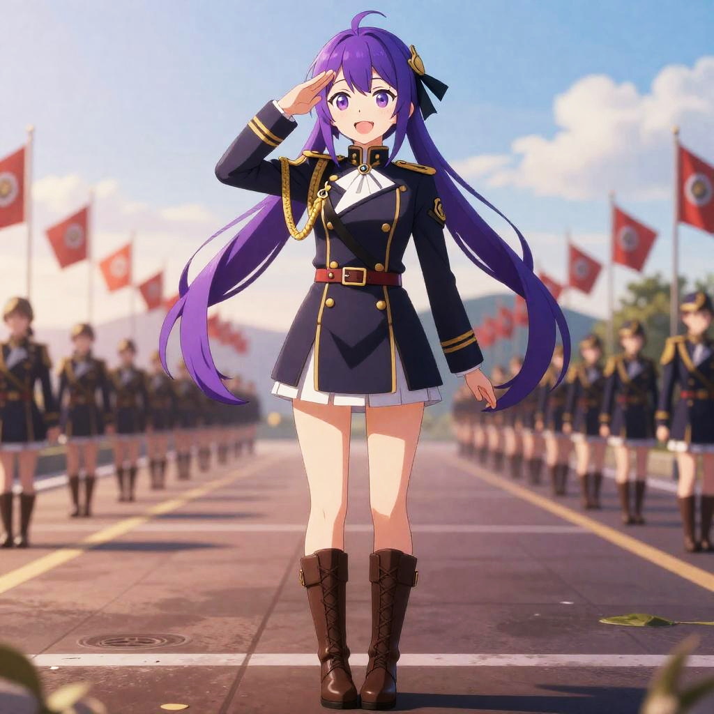 3D anime-style full body depiction of a girl with vibrant purple twin tails and purple eyes, wearing a Japanese school uniform (serafuku) including a short-sleeved top with a purple neckerchief, black thigh-high stockings, gloves, and a purple choker. She stands shyly in an outdoor school courtyard adorned with cherry blossoms under soft backlit sunset lighting, tilting her head and adjusting her choker.