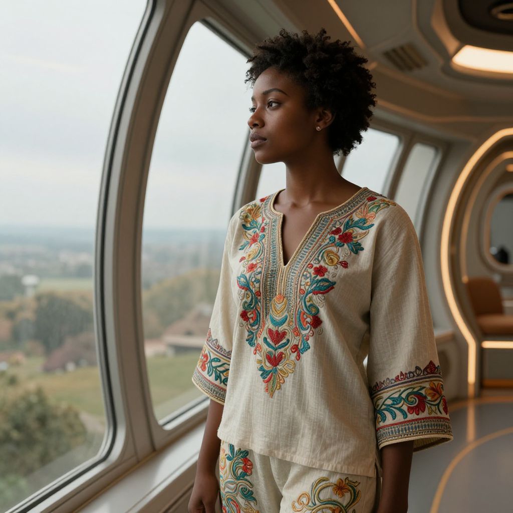 Photograph of a young African woman with dark skin and natural, curly black hair standing by a large, curved window on a modern, elevated train. She wears a cream-colored, loose-fitting, embroidered blouse and matching pants with intricate, colorful floral patterns in red, green, and blue. The train interior features curved, illuminated walls and a view of a hazy, green landscape outside. She gazes thoughtfully into the distance, her expression calm and contemplative. The image emphasizes her elegant, traditional attire amidst a futuristic setting.