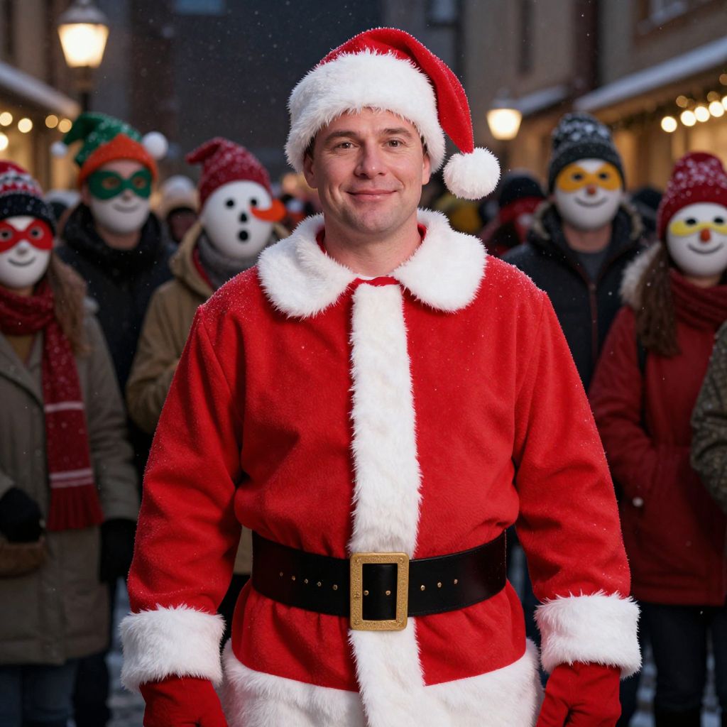 A man wearing a detailed red and white Santa suit with a white collar, red belt, and a classic white felt hat on his head, standing confidently and looking directly at the camera with a warm, friendly smile. His suit is slightly fitted, highlighting his well-proportioned frame, and he has a gentle expression that conveys holiday cheer. In the background, a festive crowd of people wearing various colorful masks—such as masks of elves, ghosts, and snowmen—gather in a dimly lit winter street, adding to the magical, holiday atmosphere. Soft lighting and subtle snowflakes drift in the air, enhancing the cozy, nostalgic ambiance of the scene.