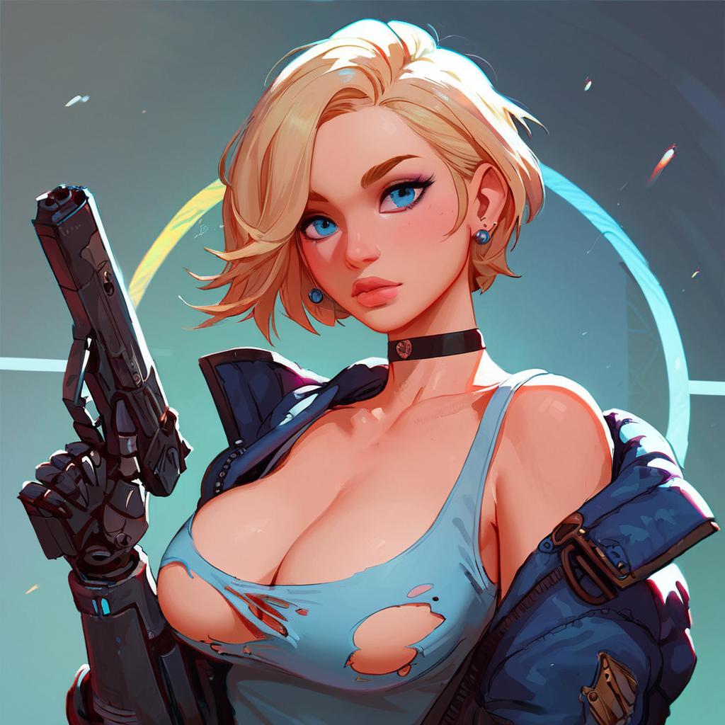 Digital artwork of a blonde woman with short hair, blue eyes, and a mole under her eye. She has large breasts visible through a torn white tank top and wears a blue off-shoulder jacket. The woman holds a gun with a mechanical gloved hand. She accessorizes with blue earrings and a black choker with a pendant. The image focuses on her upper body with a neutral background.