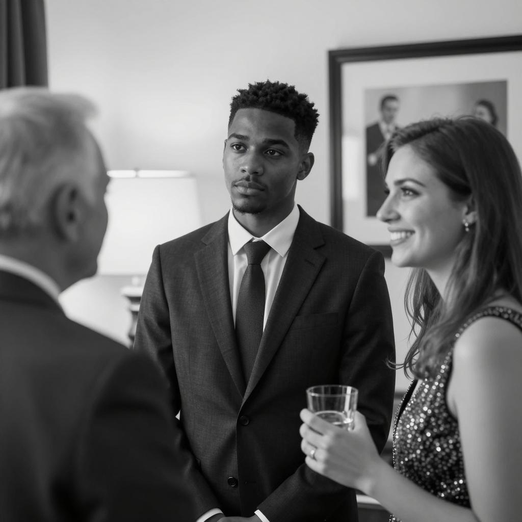 Photograph of three women sitting at a round table outdoors. Blonde woman in white sleeveless top, black-haired woman in patterned top, brunette woman in gray top with white flower. Blue gift box with ribbon on table, purple tablecloth, white chairs, small flowers, cups. Blonde woman with neutral expression, others smiling, engaged in conversation. Green foliage in background.