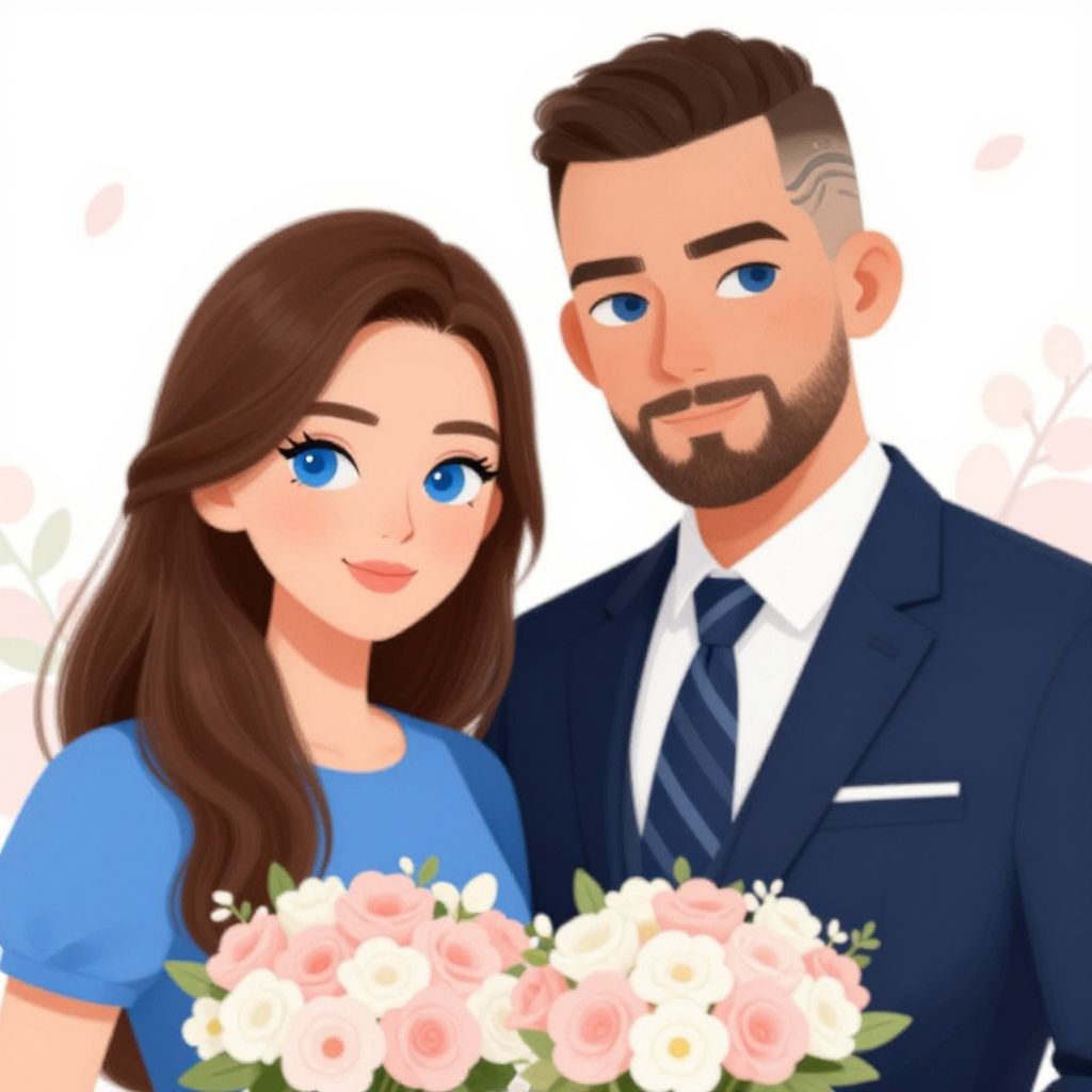 Digital illustration of a couple with bright blue eyes and soft facial features, dressed formally. The woman has long brown hair and is wearing a blue top, while the man has a trimmed beard, unique shaved hairstyle with futuristic tattoos, and is wearing a navy suit with a striped tie. Both hold bouquets of pink and white flowers, set against a light background with hints of petals and branches.