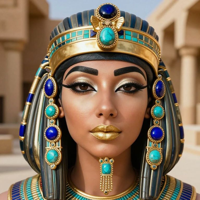 Close-up of Egyptian princess makeup highlighting metallic gold lips, intense kohl liner around almond-shaped eyes, accented with turquoise and lapis lazuli jewels in a desert palace setting