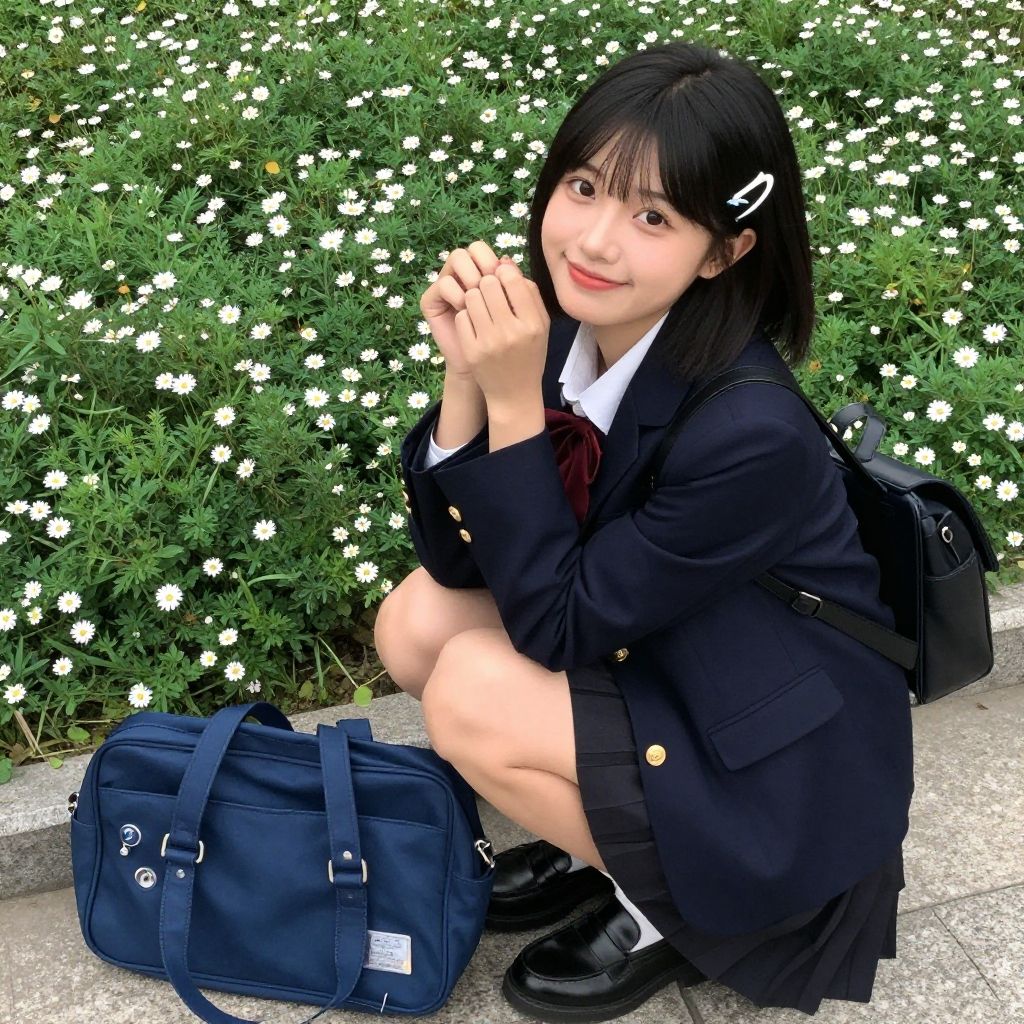 Photograph of an Asian schoolgirl with black bob haircut, white flower clip, black blazer, plaid skirt, and black shoes, sitting on