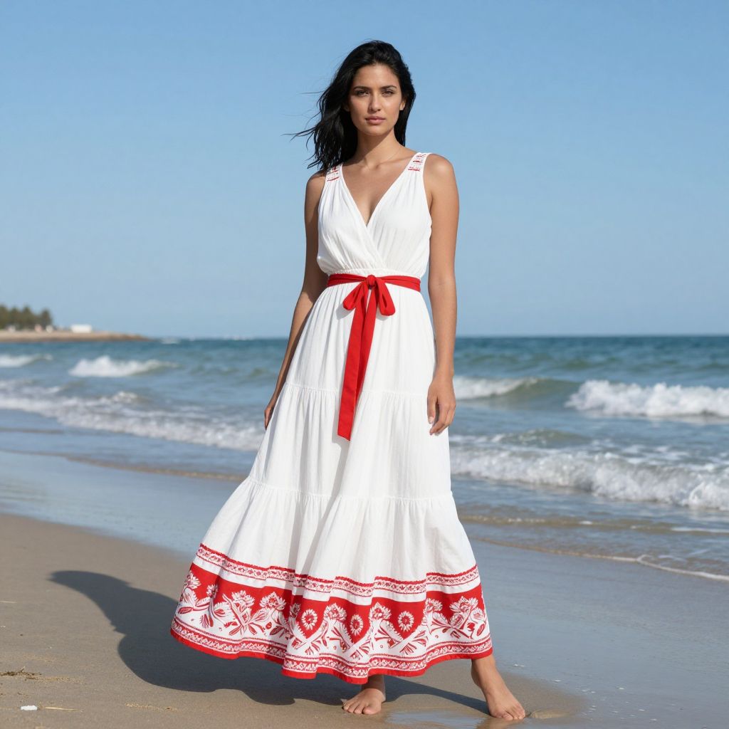 A photograph of a young woman with dark hair standing on a sunny beach. She's wearing a flowing white dress with red and white patterned trim at the hem and waist, tied with a red sash. She's barefoot, standing near gentle waves, with a clear blue sky and distant shoreline in the background. She looks confidently at the camera.