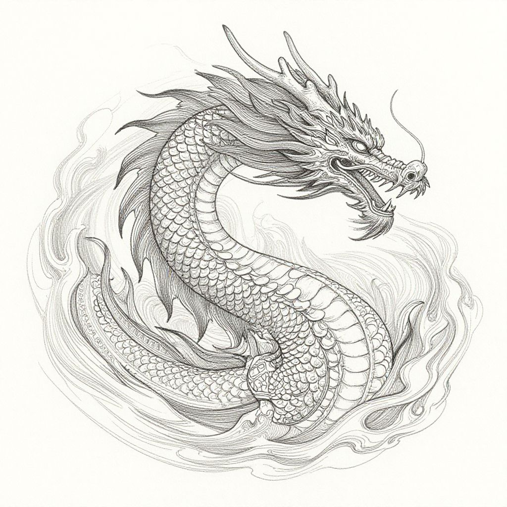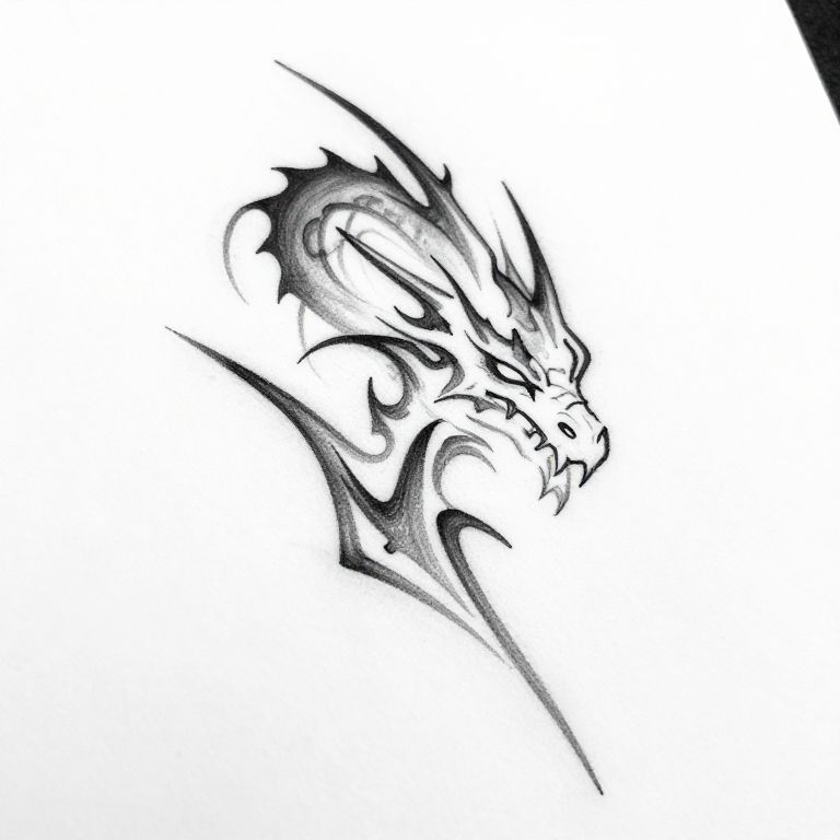 "Opacity a detailed sketch of neo-tribal dragon tattoo, minimalistic, sharp spiky edges, black and white,"