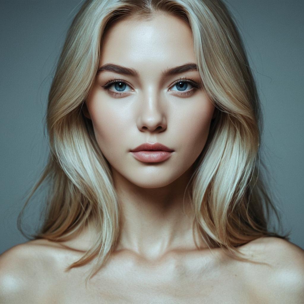 Professionally retouched portrait of a beautiful Scandinavian woman with long blonde hair and blue eyes. She is wearing a grey knitted sweater and looking directly at the camera with a soft and elegant expression. The image features soft lighting and sharp focus on her eyes, highlighting smooth skin texture and facial details in high definition.
