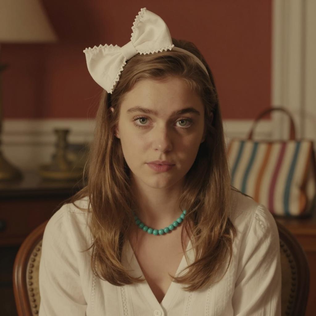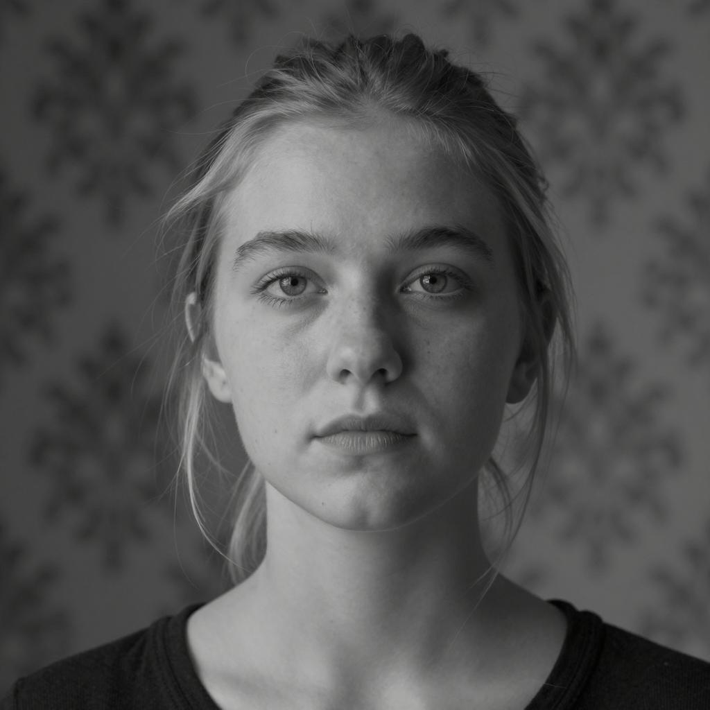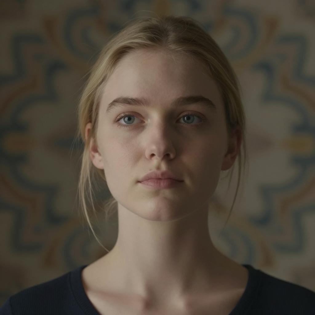 A young woman with light skin and blonde hair, looking slightly upward with a neutral expression. She has smooth skin and small, subtle facial features. Wearing a dark top, her hair is loosely pulled back. Background is blurred, with ornate, dark patterns. She is centered in the frame.