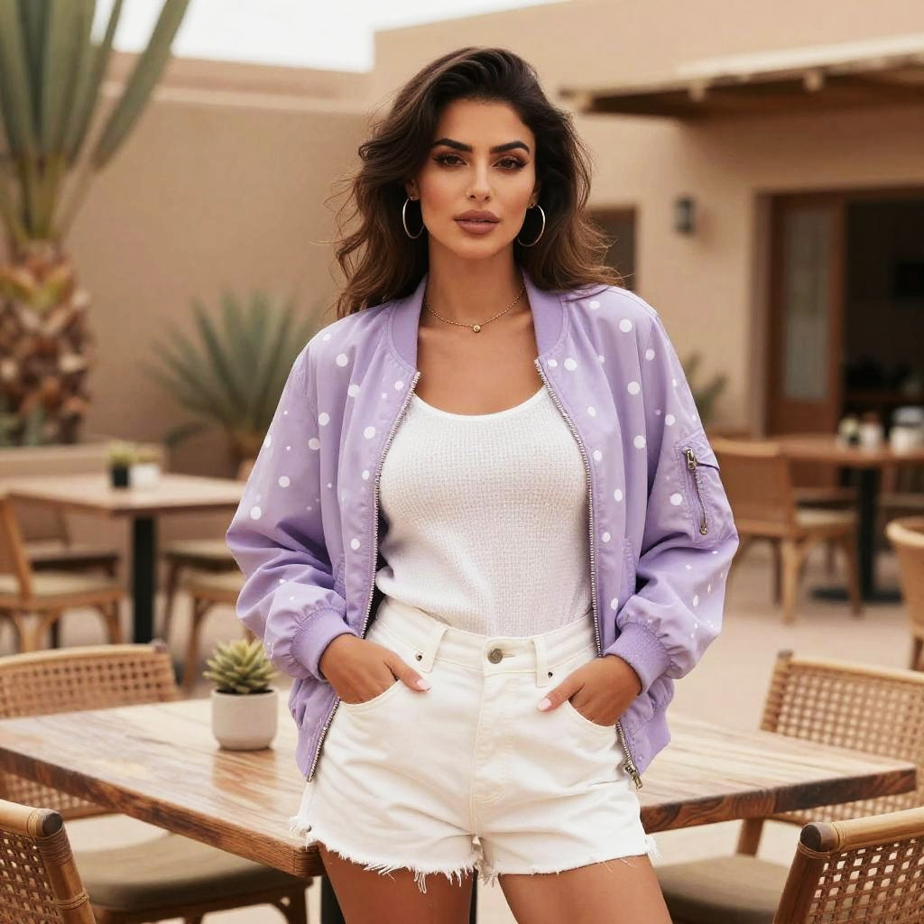 A voluptuous woman in casual streetwear, wearing a light purple bomber jacket with white polka dots over a white textured tank top and high-waisted off-white denim shorts, stands confidently at a bistro table in a desert oasis, hands in pockets. Visual style: Mappa Studio. Sexy. Pretty face and beutiful eyes