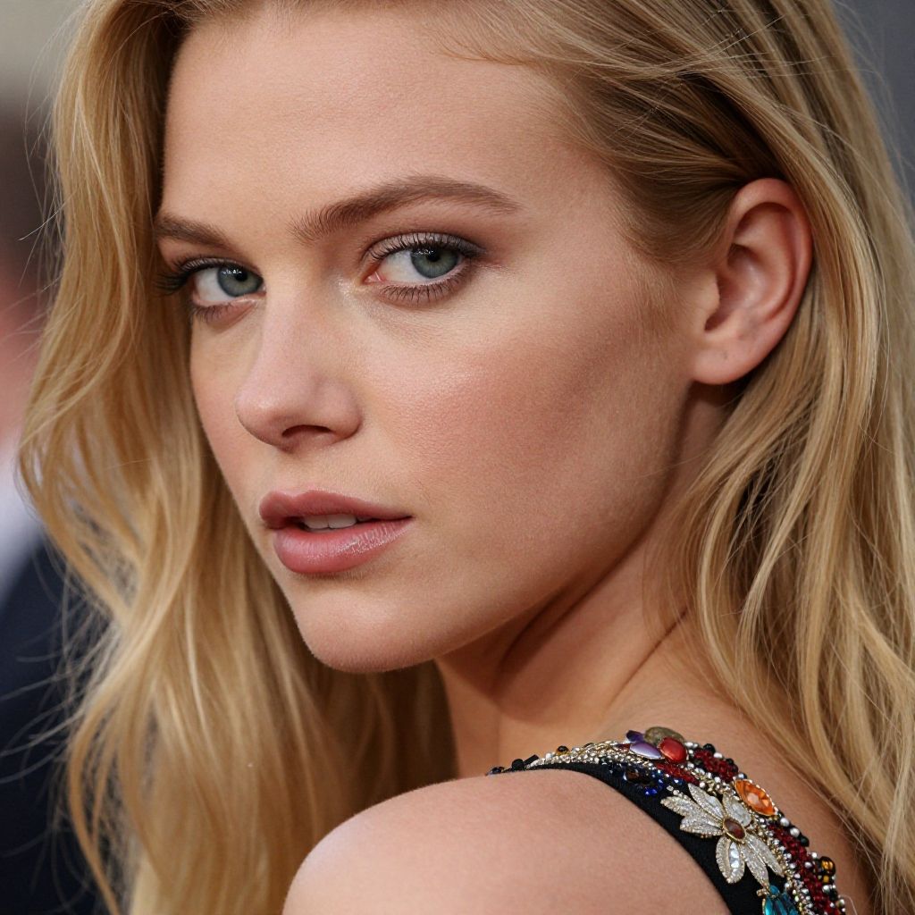 This is a high-resolution photograph of a blonde woman with fair skin and blue eyes. She has slightly wavy hair that falls over her shoulders. Her makeup is subtle, with light pink lipstick and dark eyeliner accentuating her eyes. She is wearing a black dress adorned with intricate, colorful floral patterns. The background is blurred, focusing attention on her face. Her expression is serious and slightly pensive. The lighting is soft, highlighting her facial features and the texture of her skin.