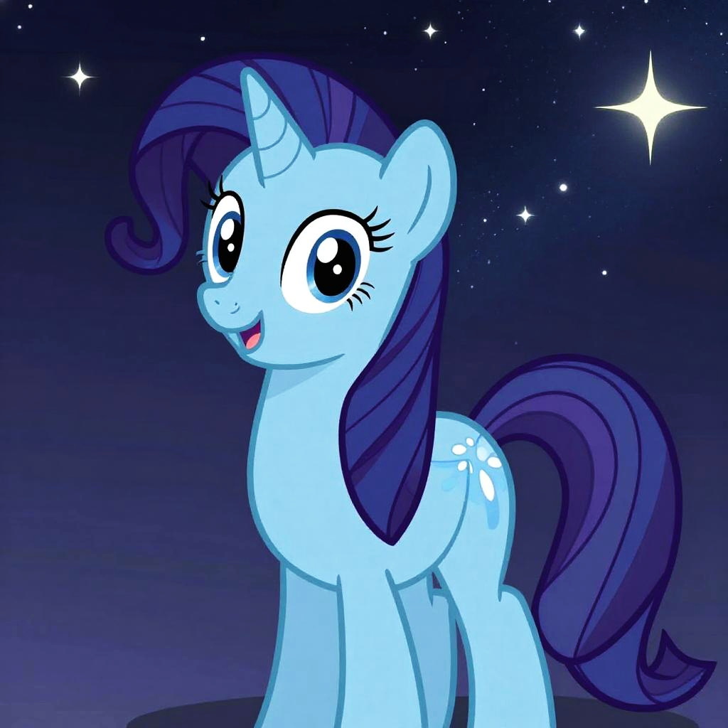 Digital artwork of a light blue, horned pony with large eyes, dark purple mane and tail, smiling under a starry night sky.