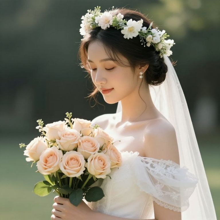 Photograph of a young Asian bride with fair skin and dark brown hair in an updo, adorned with a white floral crown and veil. She wears an off-the-shoulder white lace wedding dress. She holds a bouquet of pale pink roses with green leaves. Her eyes are closed, and she has a serene expression. The background is a blurred, sunlit outdoor setting with greenery. Soft light highlights her delicate features and the textures of her dress and flowers.
