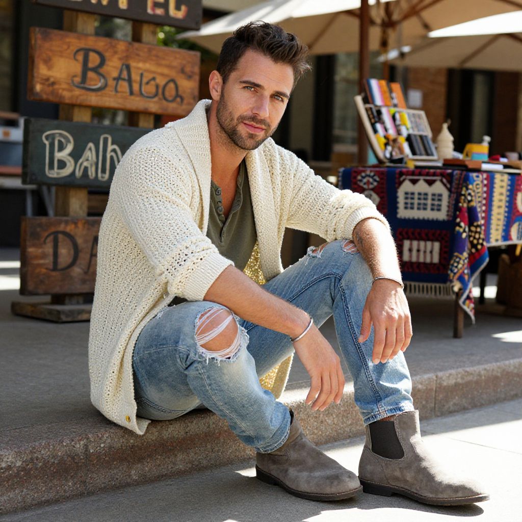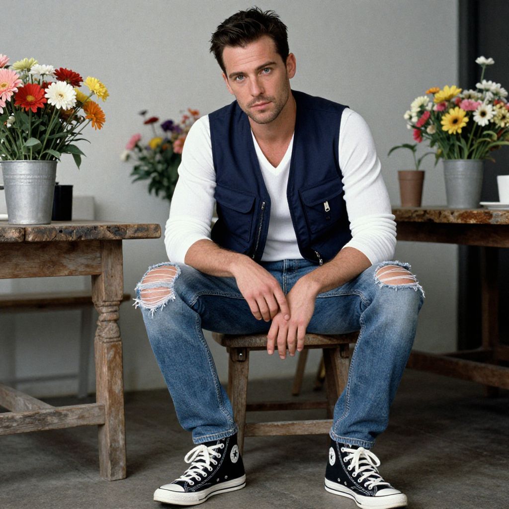 Photograph of a handsome, bearded man with short brown hair, wearing a white knit sweater, light blue pants, and white sneakers, sitting in