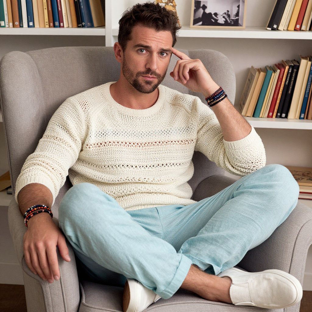 A man, lightweight crochet sweater, relaxed-fit linen trousers, slip-on canvas shoes, multi-colored friendship bracelets, pastel hues, cozy reading nook, plush armchairs, shelves of books, vintage photo style, thoughtful expression. Man has masculine face and piercing eyes