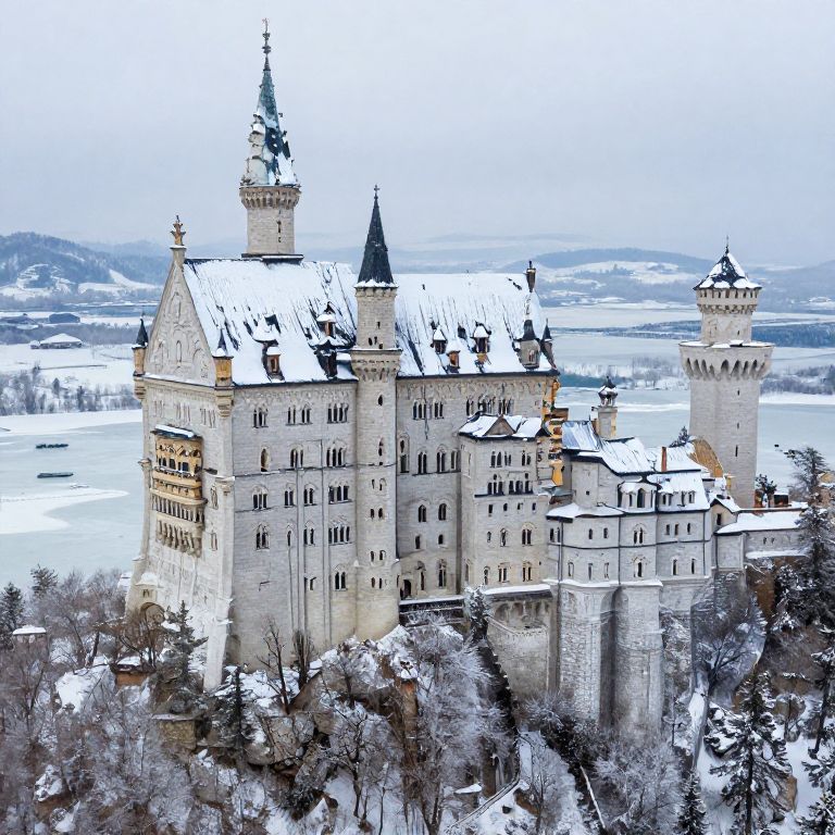 Photograph of Neuschwanstein Castle, snow-covered, with snow-dusted roofs and spires, surrounded by a winter landscape of snow-covered trees