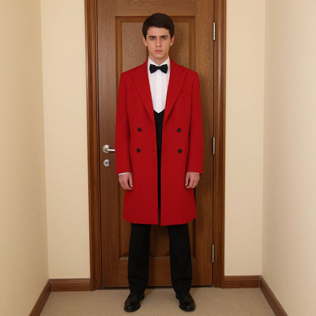 Photograph of a young man standing in front of a wooden door with a silver handle, set against cream-colored walls and beige carpet. He has short, dark brown hair and a serious expression. He wears a red double-breasted coat with black buttons, a white dress shirt, black bow tie, black trousers, and black shoes. The coat is slightly oversized, covering his hands. The lighting is even, highlighting his formal attire. The overall composition is minimalist, focusing on the subject's formal outfit and neutral background.