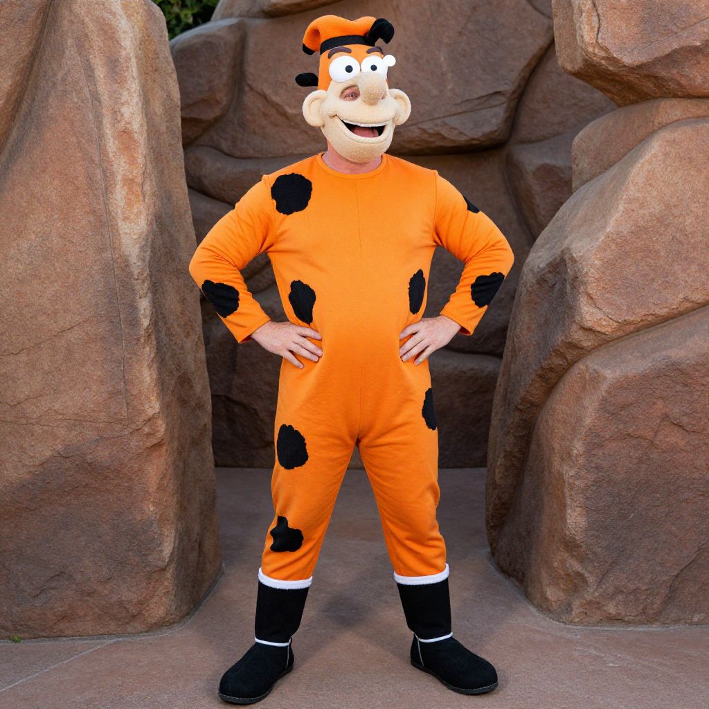 Photograph of a person dressed in a bright orange, long-sleeved, full-body costume resembling Fred Flintstone, complete with black cow-like spots, black shoes, and a matching black hat. The character has a white mustache, black eyes, and a wide smile. The background features large, brown, rocky formations. The person stands confidently with hands on hips, feet shoulder-width apart, and is centered in the frame. The costume is tight-fitting and the texture appears to be smooth, typical of synthetic fabric. The lighting is natural, highlighting the vibrant orange color.