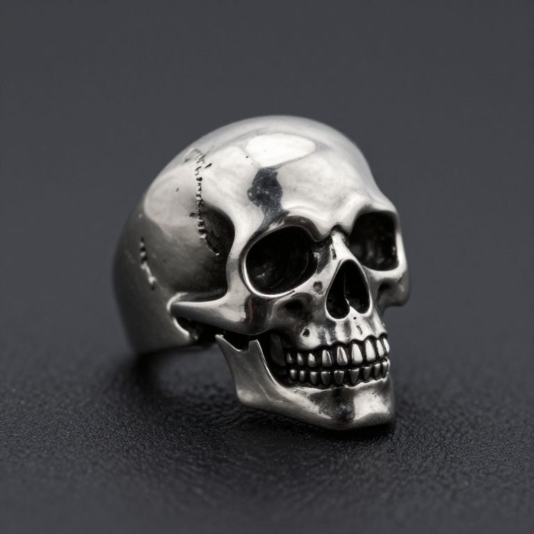 Photograph of a shiny, metallic silver skull with deep black eye sockets and teeth, set against a dark, textured background.