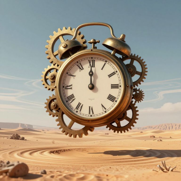Steampunk-style alarm clock with gears floating in a desert under a clear blue sky, with swirling sand patterns below.