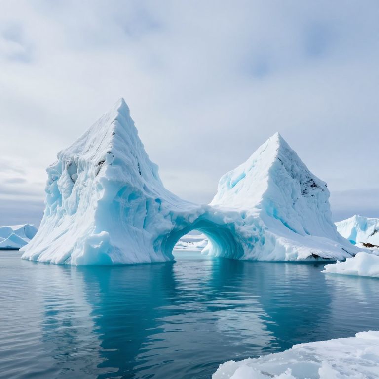 Two towering ice pyramids stand majestically above a serene turquoise sea, connected by a natural archway of frozen water that forms a delicate, shimmering bridge, reflecting the tranquil beauty of nature's icy embrace.
