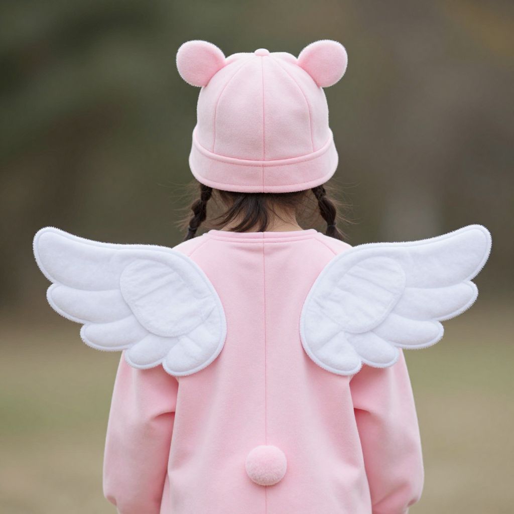 Photograph of a child from behind wearing a pink bear hat with ears, white angel wings, and a matching pink outfit, standing in a blurred outdoor