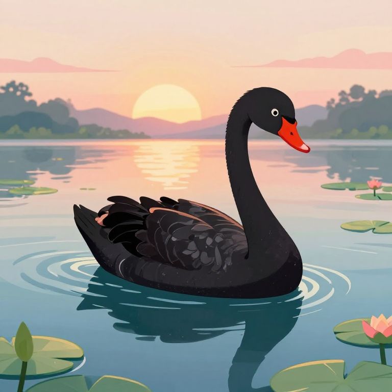 Black swan cartoon gracefully gliding on a serene lake at sunset, stylized with smooth lines and bold colors, surrounded by gentle ripples and vibrant lily pads, whimsical and enchanting atmosphere, high detail, soft pastel background
