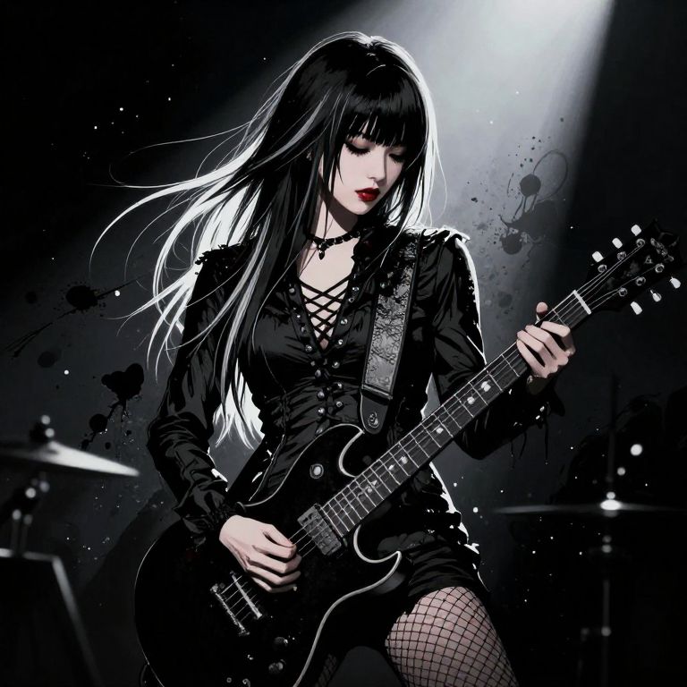 Digital artwork of a stunning Japanese heavy metal guitarist with long dark hair featuring platinum streaks. She is playing an electric guitar on stage under a spotlight, wearing a front-laced black blouse and fishnet stockings. The background is dark with abstract ink splashes, emphasizing her sultry and seductive appearance with red lips and bangs framing her face.