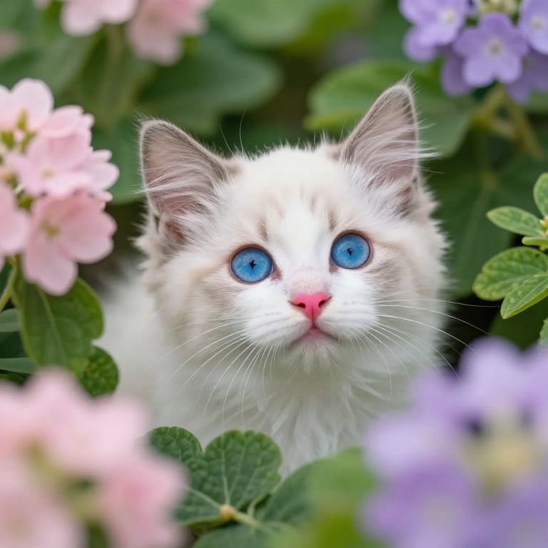 Photograph of a fluffy, long-haired cat with striking blue eyes and a pink nose, surrounded by pink and purple flowers with green leaves. The cat's white and light brown fur contrasts with the colorful blooms, which are softly blurred in the foreground and background. The cat's ears are upright, and its expression is curious and attentive. The image is sharp, capturing the cat's detailed fur texture and vibrant eye color, set against a lush, floral backdrop. The overall composition is bright and lively, emphasizing the cat's striking features and the colorful flowers.