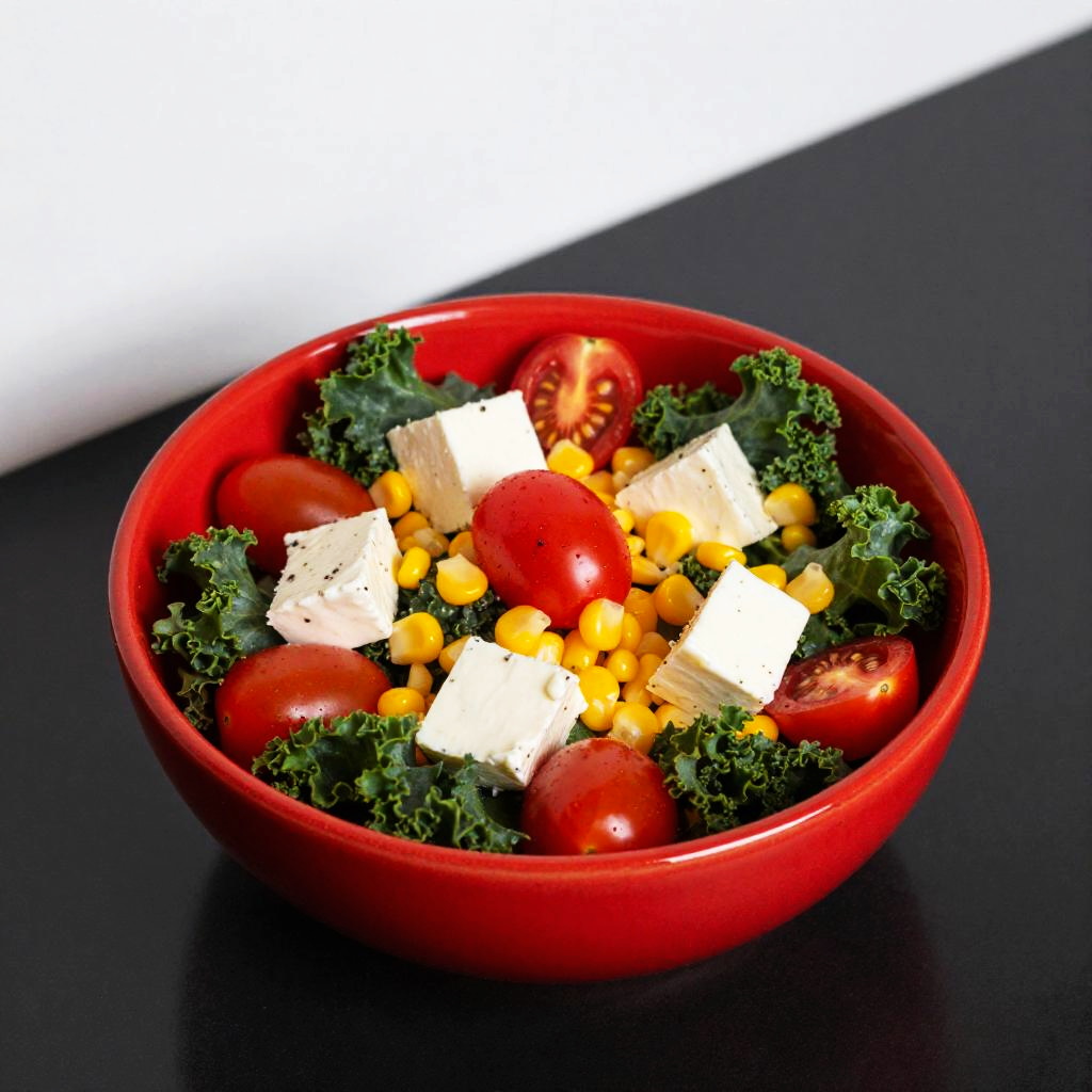 Photograph of a vibrant, colorful salad in a bright red ceramic bowl. The salad features chunks of creamy white cheese, juicy red cherry tomatoes, yellow corn kernels, and dark green kale. The bowl is placed on a sleek, black surface, with a strong light source from the upper left, casting a shadow on the right. The overall style is modern and fresh.
