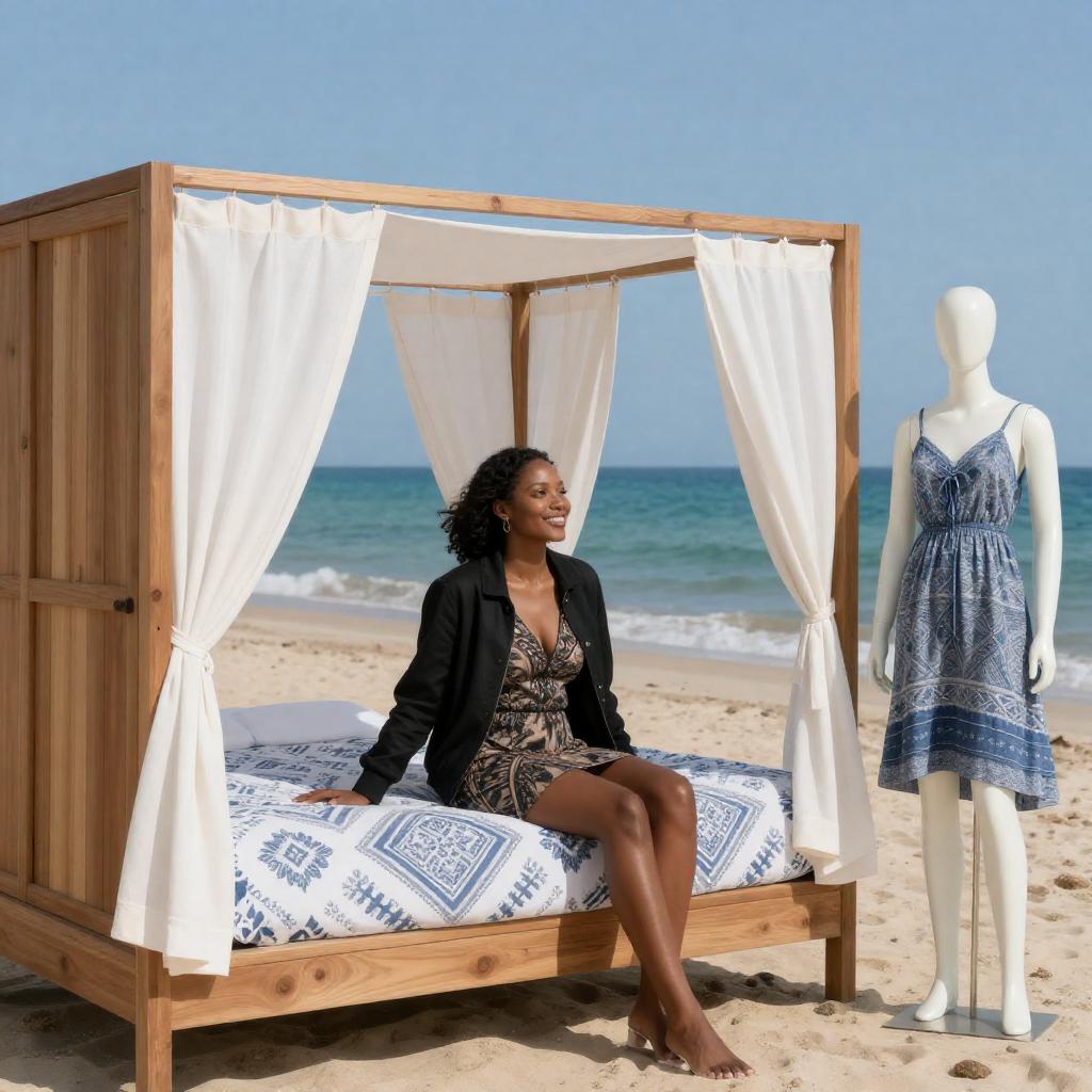 Photograph of a dark-skinned woman with black curly hair sitting barefoot on a wooden bed with white curtains and a blue and white patterned bedspread on a sandy beach. She wears a patterned dress with a black jacket. To the left is a wooden wardrobe, and to the right stands a white mannequin dressed in a blue patterned sundress. The turquoise ocean and clear blue sky form the background.