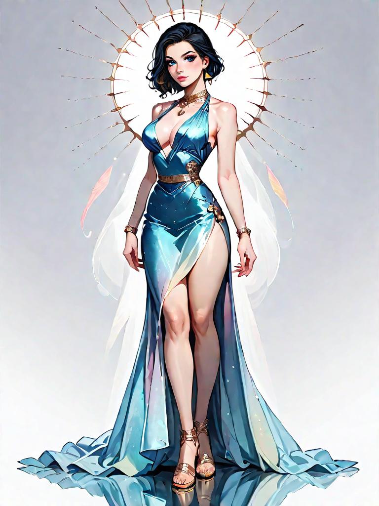 1girl, source_comics, realistic face, full body shot, Woman, modern feminine, mint green skater dress, cut-out triangle details at neckline, sleeveless, fitted bodice, flared skirt, above-knee hemline, layered material, subtle back zipper, minimalistic gold band bracelet, plain white background.