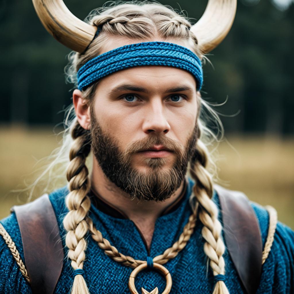 Viking outfit,male focus, facial hair, horns, 1boy, beard, braid, blonde hair, blurry background, long hair, solo focus, headband, twin braids, multiple braids, blurry, realistic, blue eyes