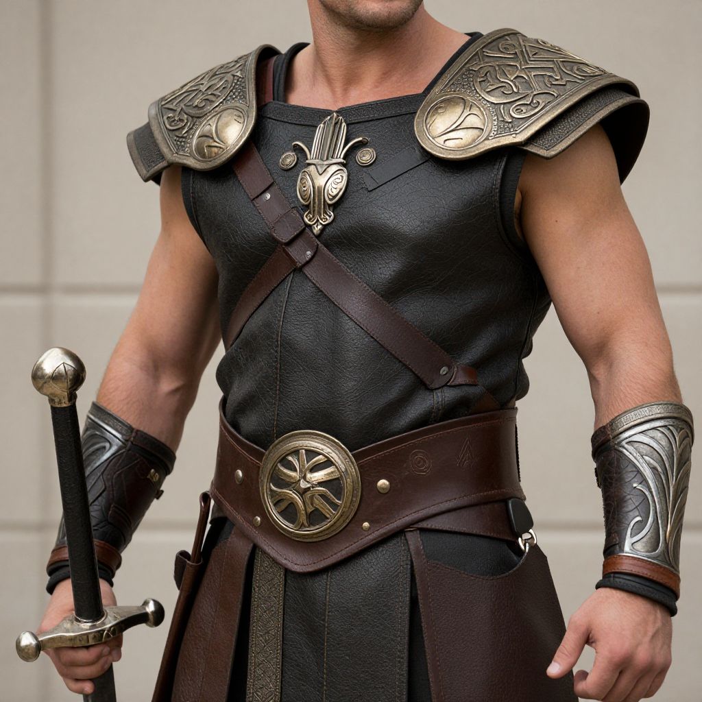 Hephaestus god costume, a close up of a man in a costume with a sword