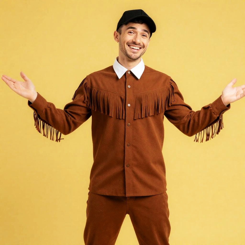 Photograph of a man with short brown hair, wearing a brown fringed shirt and pants, black cap, and white collar, smiling with open arms against a bright yellow background. His expression is joyful and energetic.