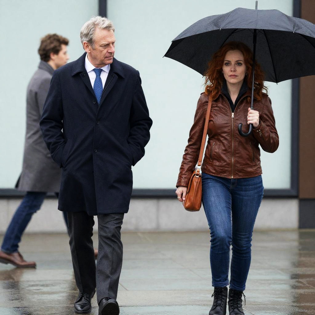 Photograph of two people walking on a wet sidewalk. A middle-aged man with gray hair in a dark coat and blue tie walks beside a red-haired woman in a brown leather jacket and jeans. She holds a brown shoulder bag and a black umbrella. A blurred person in a gray coat walks by in the background. The man looks at the woman with a serious expression. The woman has a focused expression. Light green building wall in the background.