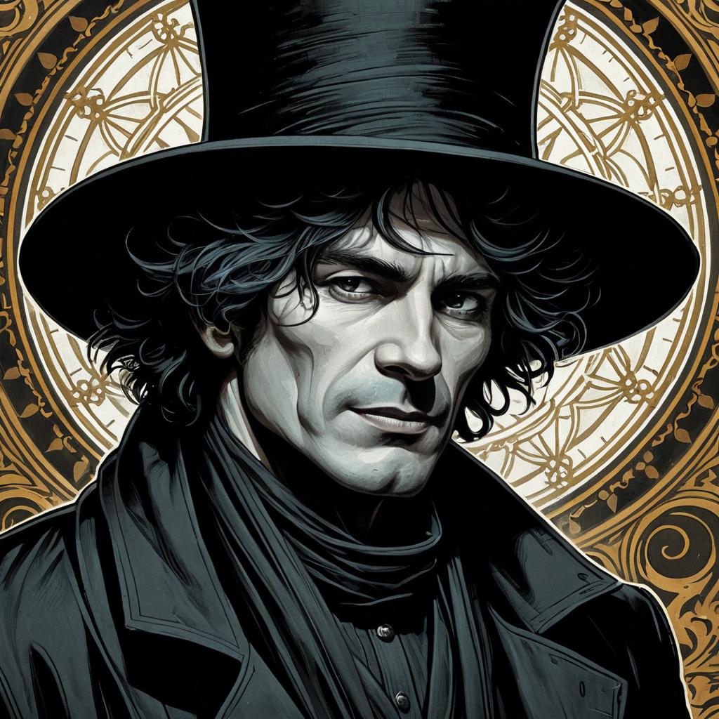 Digital painting of a middle-aged man with a serious, intense facial expression. He has dark, slightly graying hair styled back, deep wrinkles on his forehead and around his eyes, and is dressed in a dark pinstripe suit with a white shirt and dark tie. The background features a circular ornate pattern in gold and dark blue tones, enhancing the intricate and highly detailed artistic style.